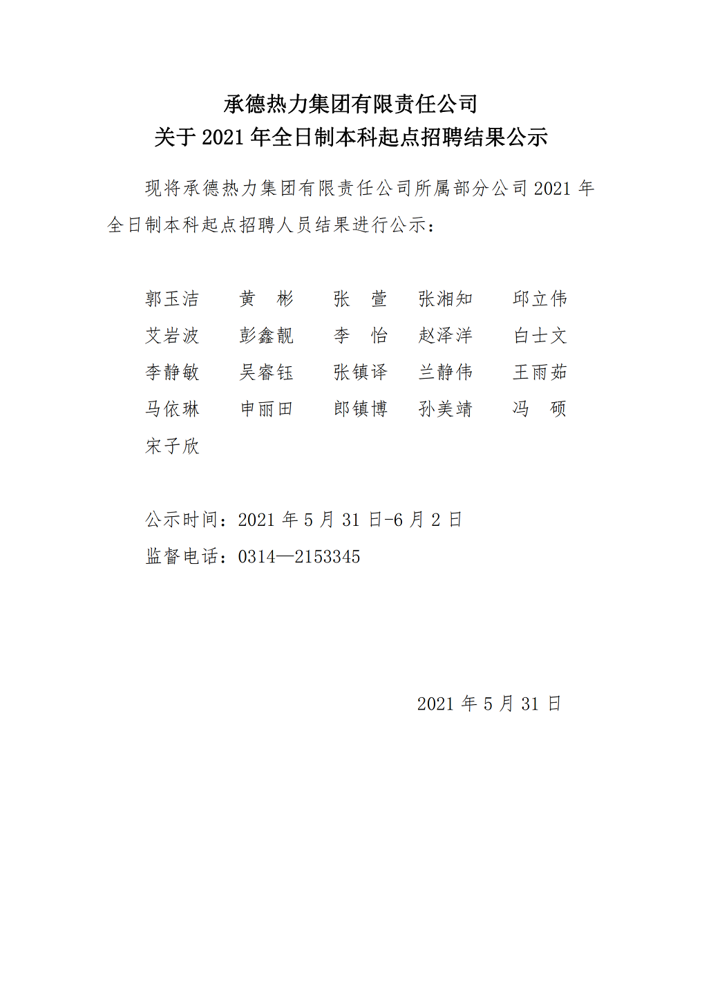 關于2021年全日制本科起點招聘結果公示