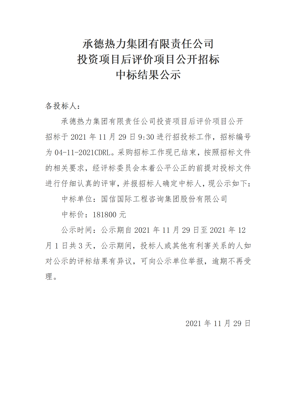 承德熱力集團(tuán)有限責(zé)任公司投資項(xiàng)目后評(píng)價(jià)項(xiàng)目公開招標(biāo)中標(biāo)結(jié)果公示