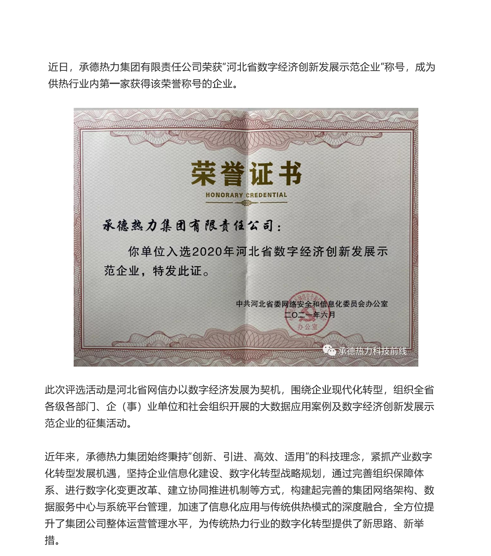 承德熱力集團(tuán)有限責(zé)任公司榮獲“河北省數(shù)字經(jīng)濟(jì)創(chuàng)新發(fā)展示范企業(yè)”稱號(hào)