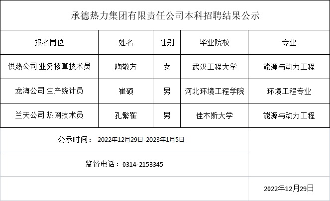 承德熱力集團有限責任公司本科招聘結(jié)果公示