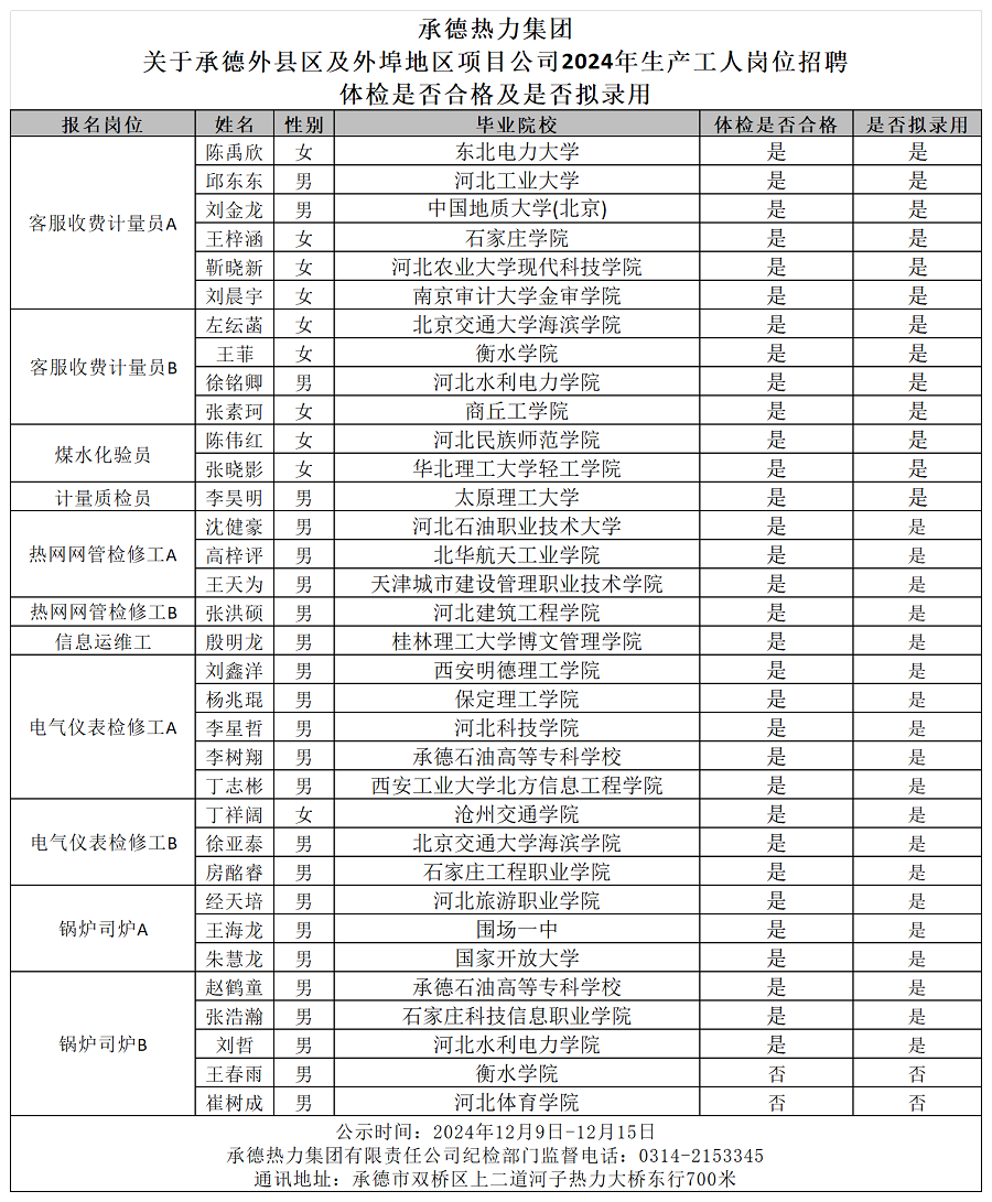 關(guān)于承德外縣區(qū)及外埠地區(qū)項(xiàng)目公司2024年生產(chǎn)工人崗位招聘體檢是否合格及是否擬錄用