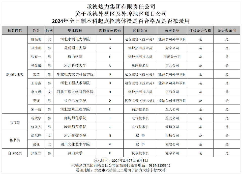 關(guān)于承德外縣區(qū)及外埠地區(qū)項目公司2024年全日制本科起點招聘體檢是否合格及是否擬錄用